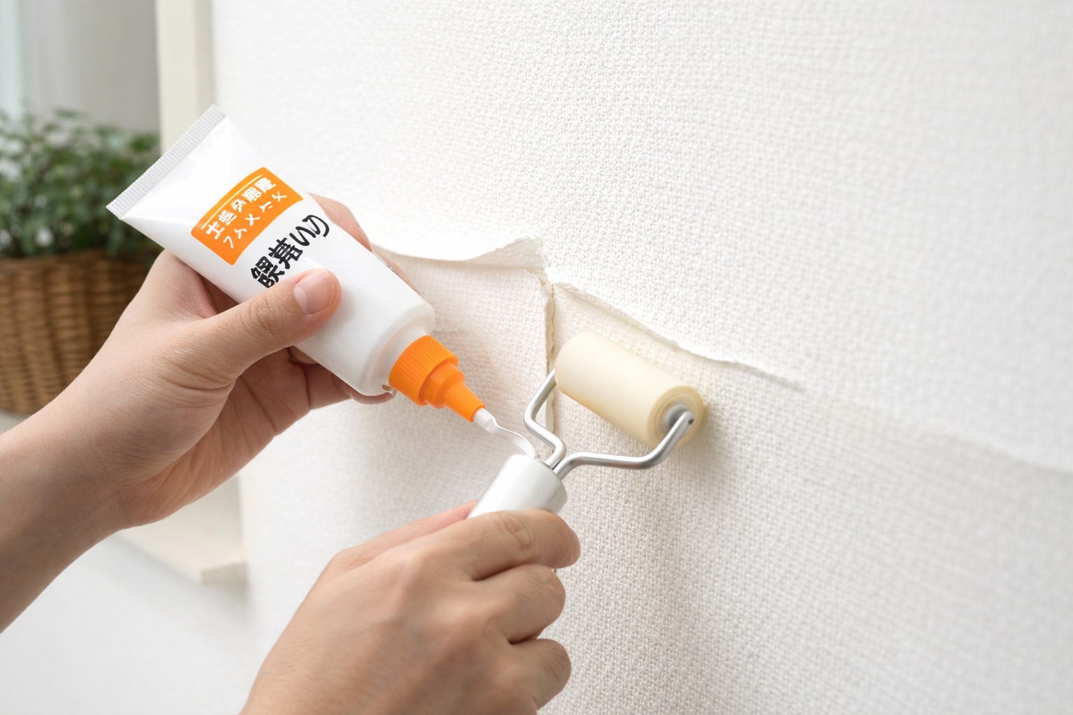 補修で一番おすすめは「壁紙用のり」です。チューブタイプは狙った場所に出しやすく、端めくれや継ぎ目に向きます。ボトル(ハケ付き等)は少し広い範囲に塗りやすいけど、出しすぎるとベタつきが残りやすいので注意。